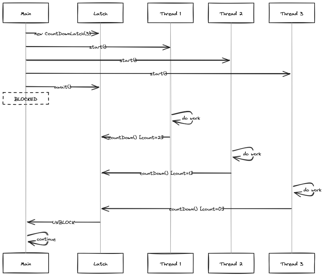 | CountDownLatch | One-shot countdown. Wait at await() until countDown() reaches zero. | Can’t reset. Always countDown in finally to avoid deadlock |