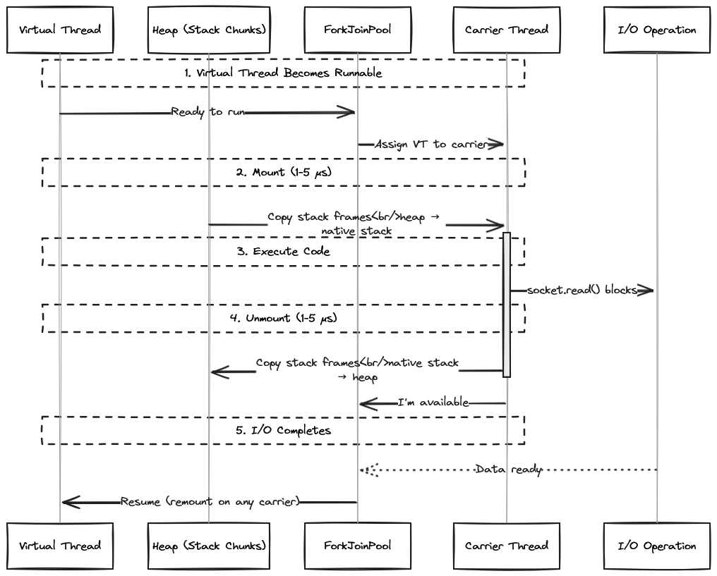 But here’s the part I missed: this creates work during mount/unmount operations. When a virtual thread mounts on a carrier, the JVM copies stack frames from the heap to the carrier’s native stack. When it unmounts, frames copy back to the heap. This is fast (1-5 microseconds) but not free.